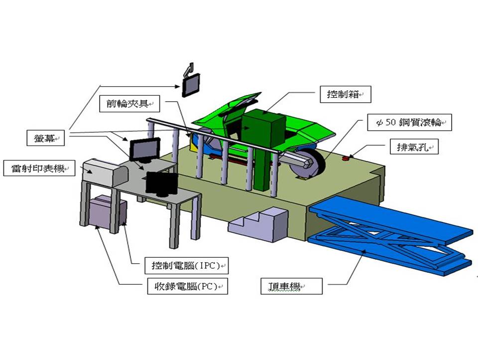 本規畫案之「機車動力計系統」可提供路阻的模擬與控制,以便進行整車的電裝試驗。測試台包括動力計本體、扭力放大器及電源及驅動器控制櫃、PLC控制及電腦人機器界面控制櫃、SCC資料收錄單元等。配合整車之操作控制模式,進行自動化測試控制及測試數據處理等功能。